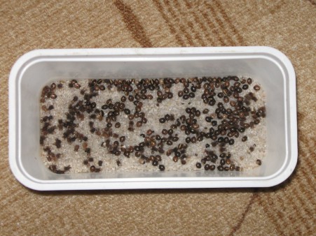 Jsou různé možnosti, jak skladovat vajíčka tak, aby měla vhodné prostředí ke zdárnému vývoji, a kyždý si najde své "finty a vychytávky". Já vyzkoušel několik způsobů. Vajíčka umisťuji do plastových krabiček o objemu 0,3-1l (podle počtu). Na dno krabičky je potřeba umístit materiál, který dobře drží vodu. Otestoval jsem křemičitý písek, vatu a lignocel. Nejlepší výsledky měl písek. Na vatě měla vajíčka sklony k plesnivění a lignocel je potřeba měnit, protože se v něm po čase začnou líhnout jakési mušky, jejichž larvy napadají vejce.